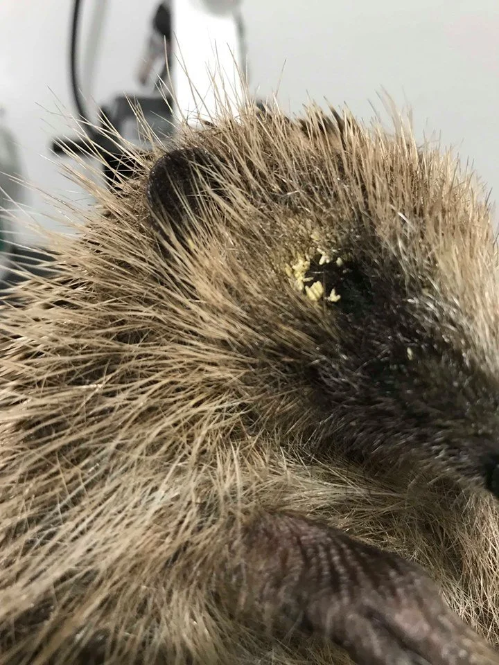 The photo shows fly eggs around the eye of a hedgehog. Flies will lay the eggs behind eyelids, in the mouth/genitals/ears, under armpits – truly anywhere, and they will hatch into maggots quickly. The maggots will start eating through any tissue they are near, causing blindness if in the eyes, and horrible wounds. These eggs need to be removed by a trained professional as a matter of urgency.